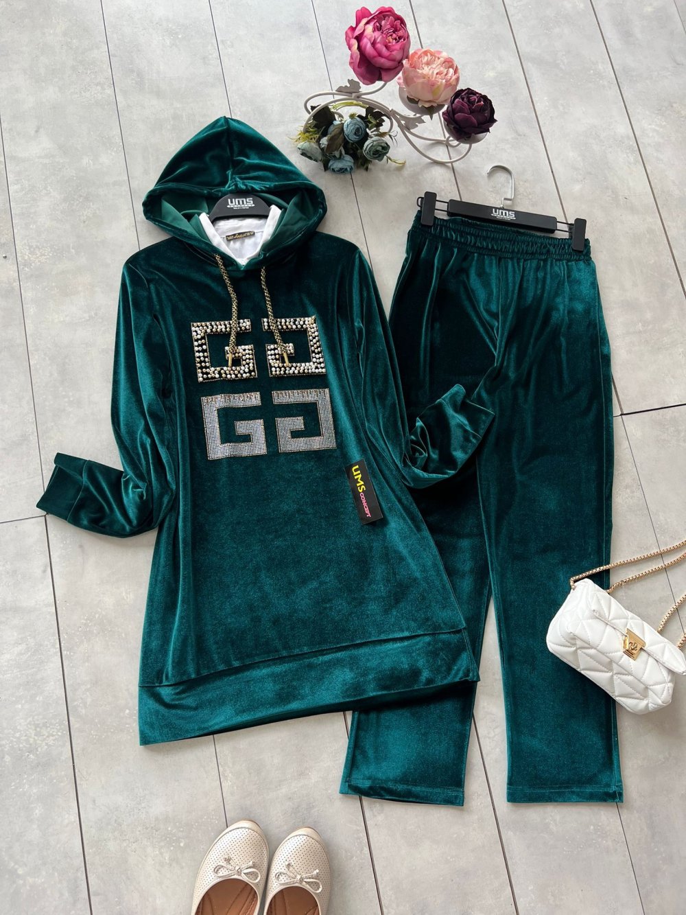 Taş işlemeli kadife takım zümrütyeşil UMS5099