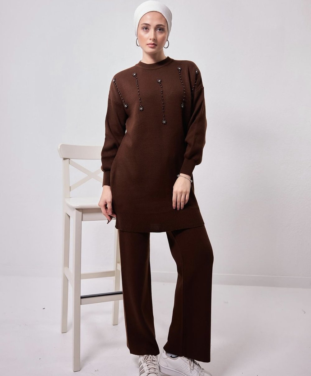 Taş İşlemeli Triko Takım Kahve NSY 30182