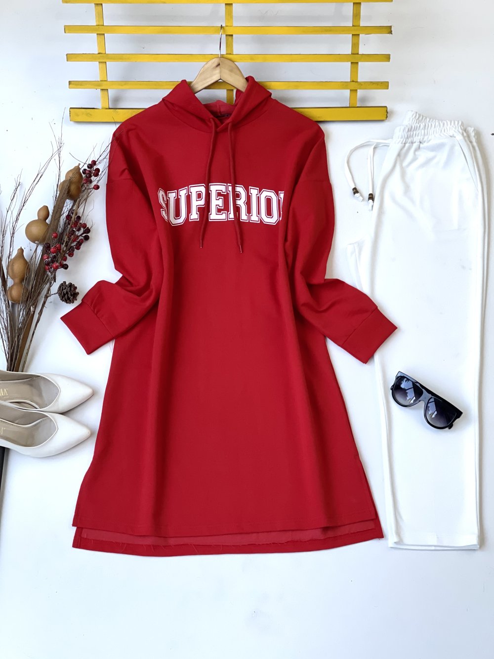 Uzun kapşonlu Ön Baskılı Tunik Kırmızı ADY30108