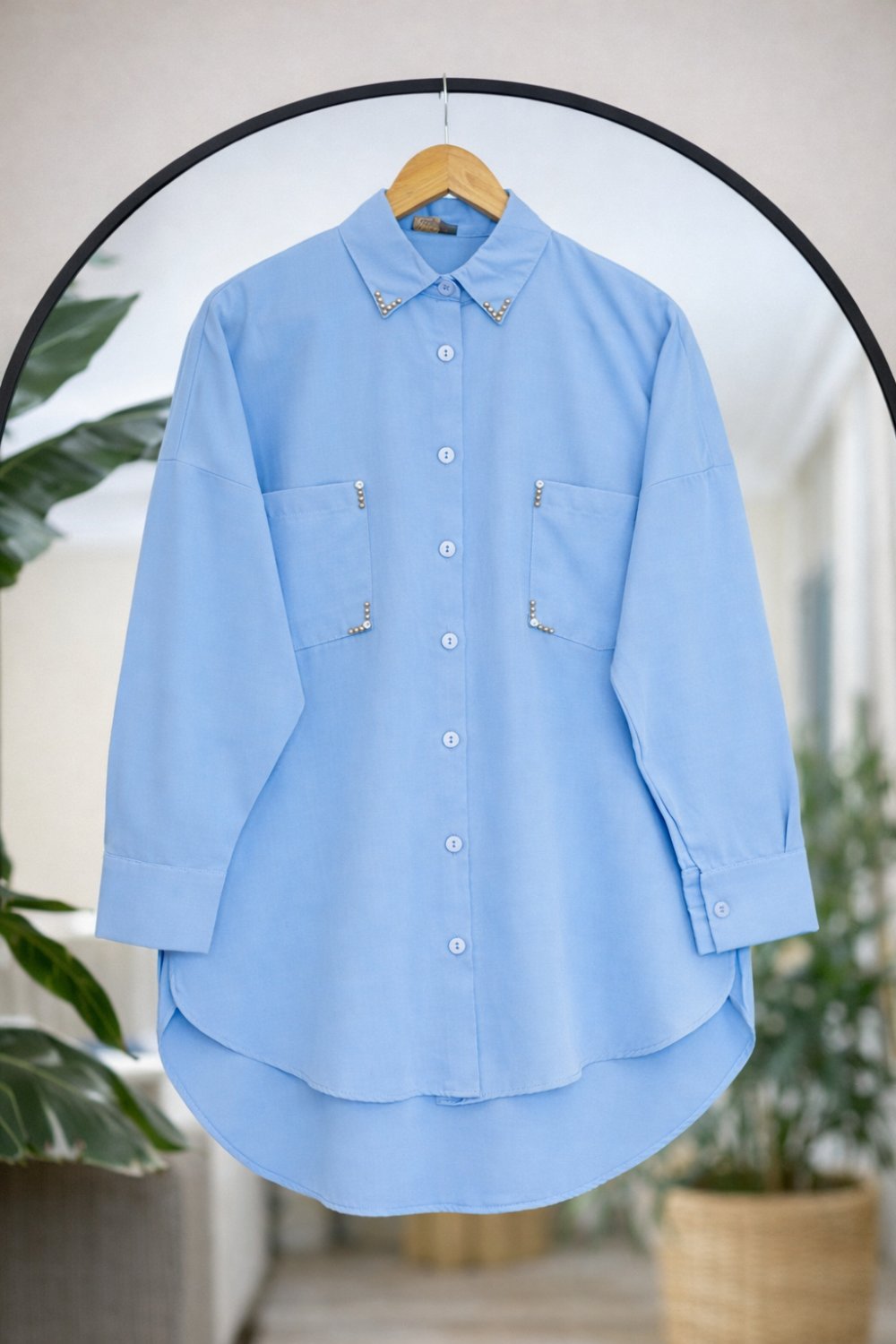 Yaka cep taş işleme gömlek tunik mavi ASM 30258