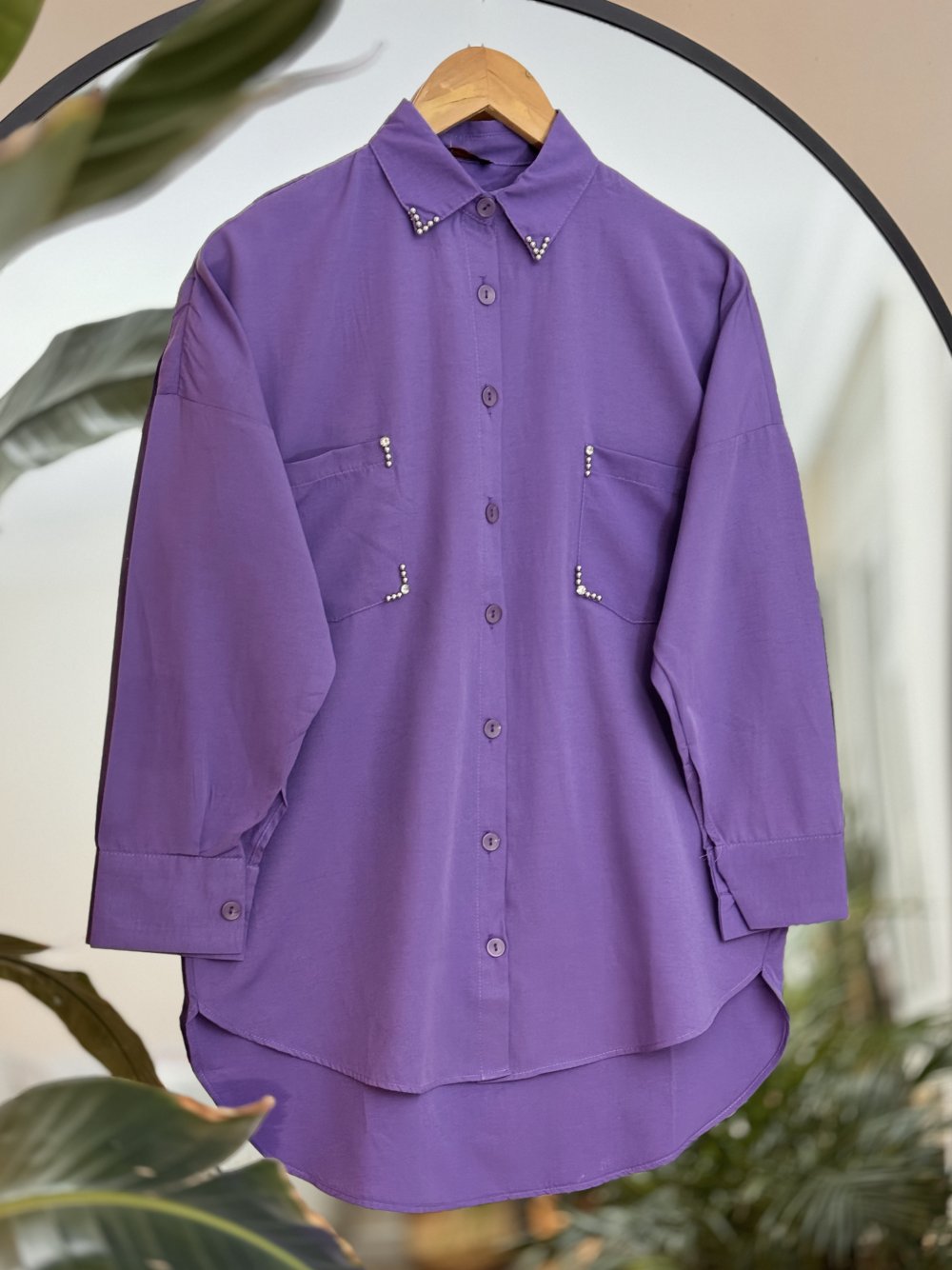 Bu ürün: Yaka cep taş işleme gömlek tunik Mor ASM 30258