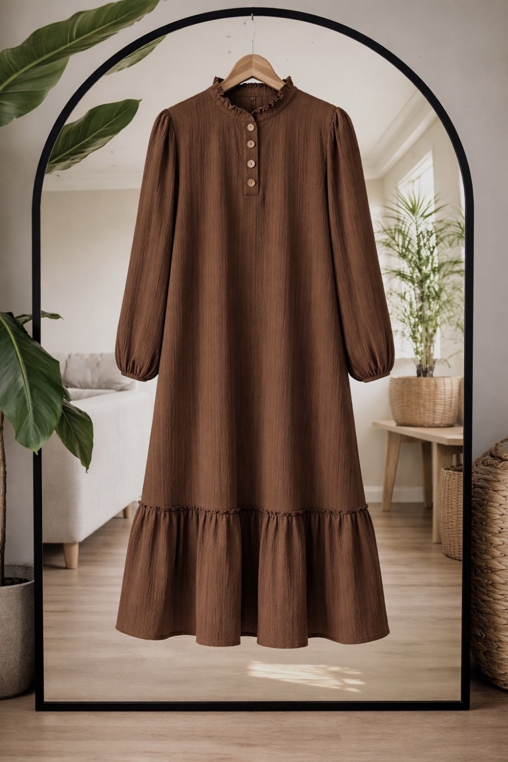 Yaka düğmeli etek fırfırlı Elbise kahverengi KR80105
