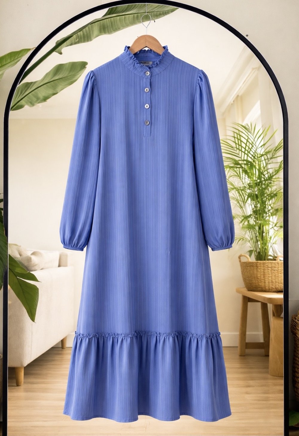 Yaka düğmeli etek fırfırlı Elbise Mavi KR80105