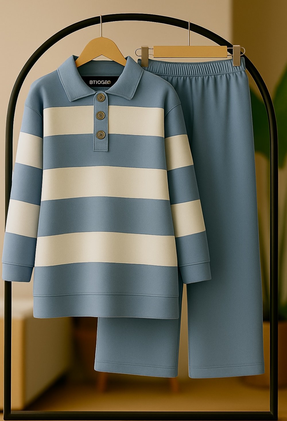 Yaka düğmeli Geniş çizgili Triko Takım Mavi TCN40135