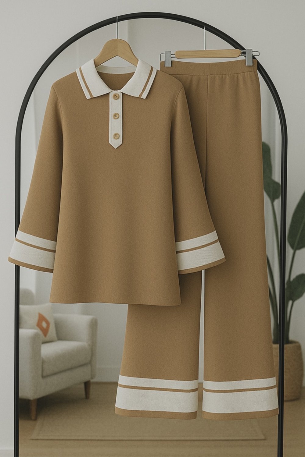 Yaka Düğmeli Paca ve kol Şeritli Triko Takım Camel TCN40137