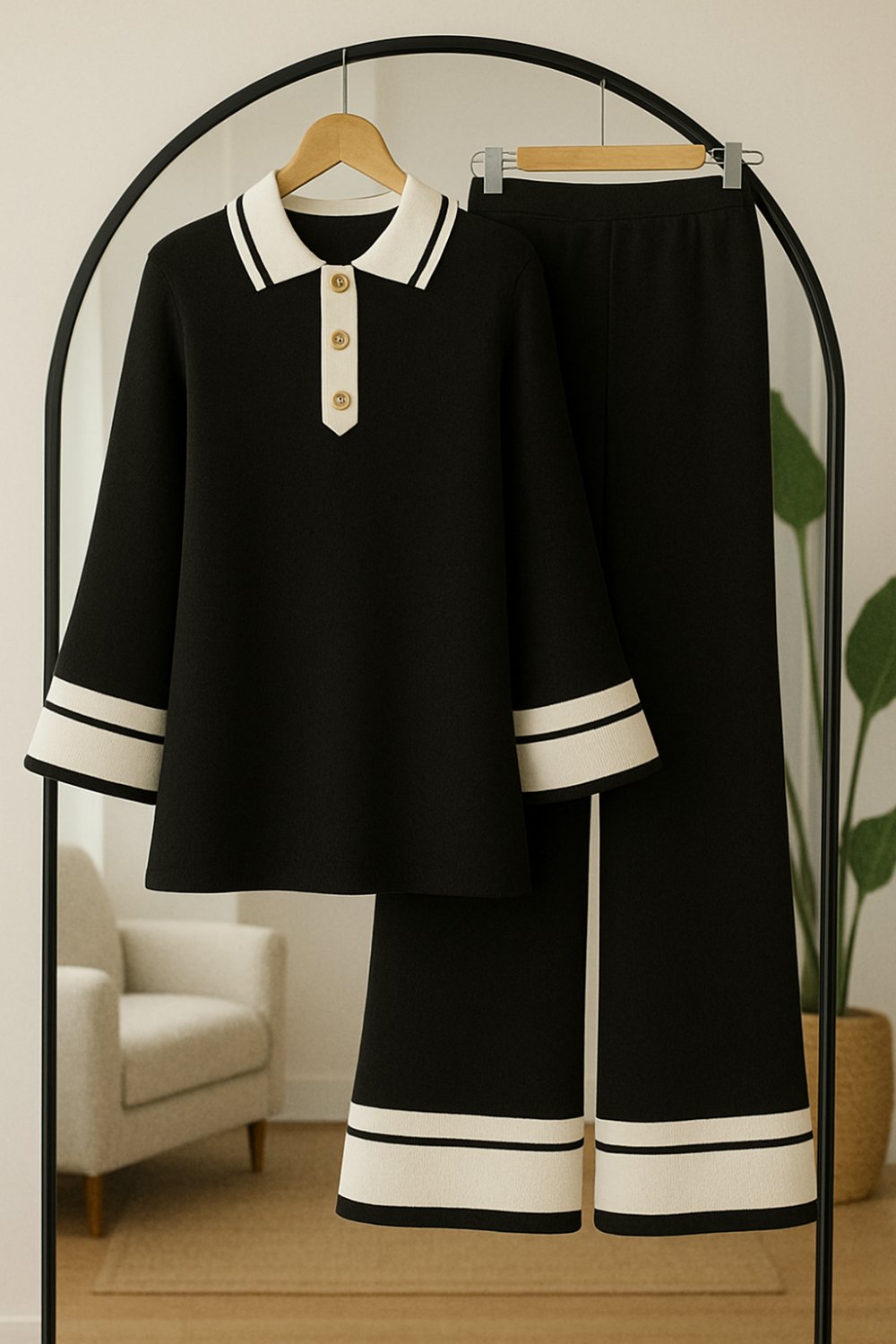 Yaka Düğmeli Paca ve kol Şeritli Triko Takım Siyah TCN40137