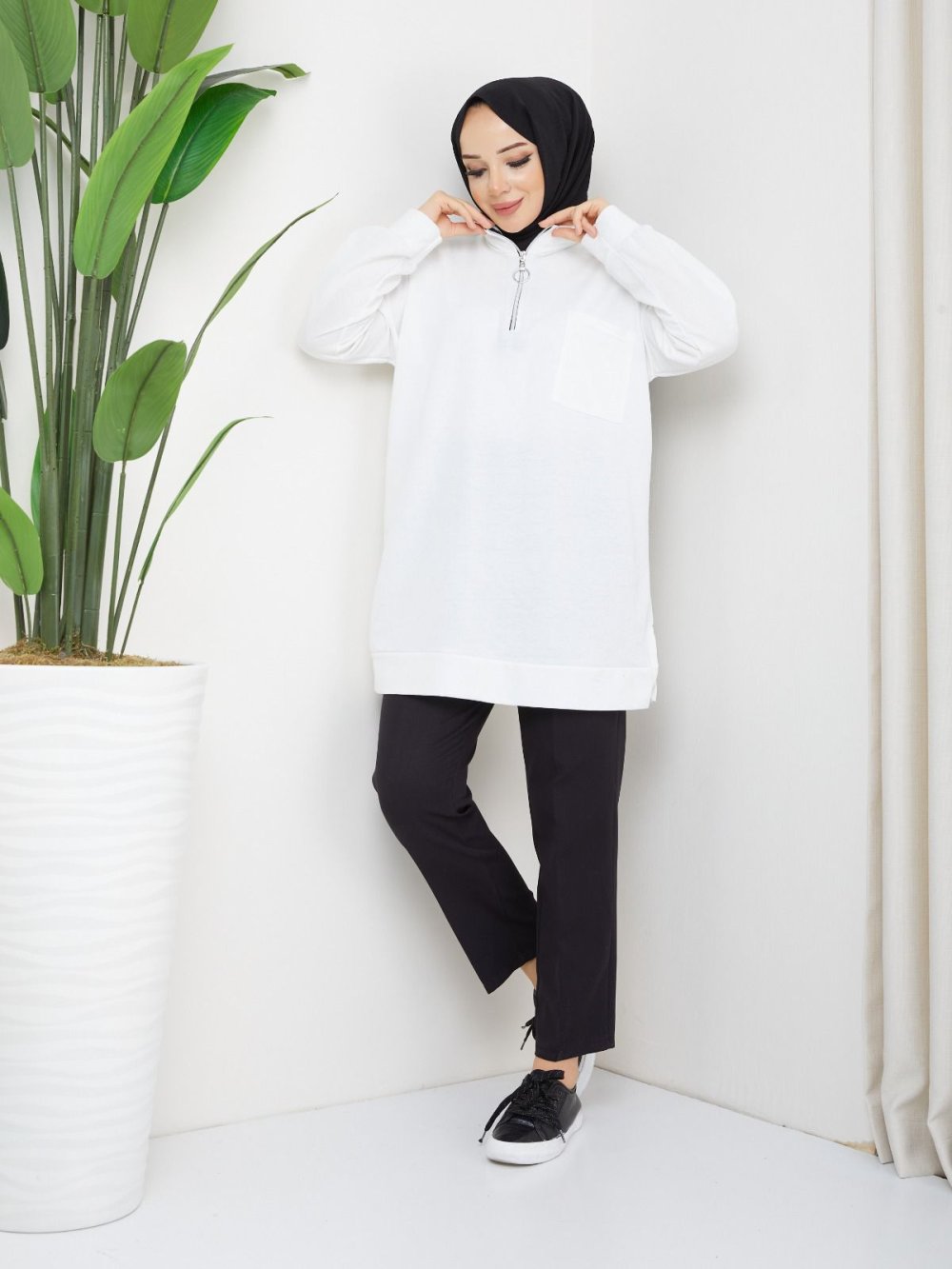 Yaka fermuarlı cepli tunik Beyaz SLT30106
