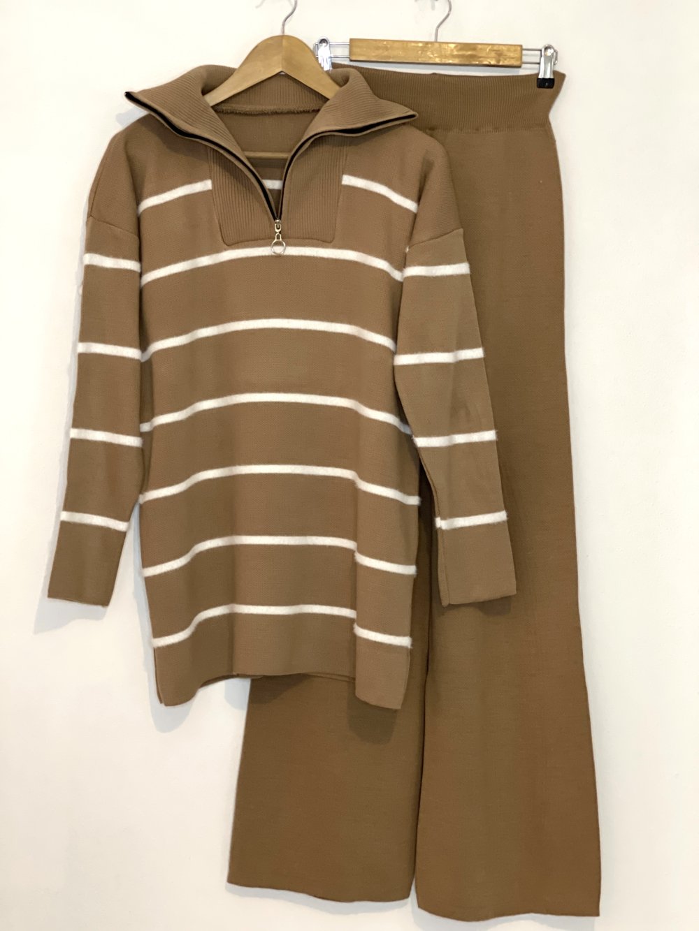 Yaka fermuarlı İnce Çizgili Triko Takım Bej SLT30168