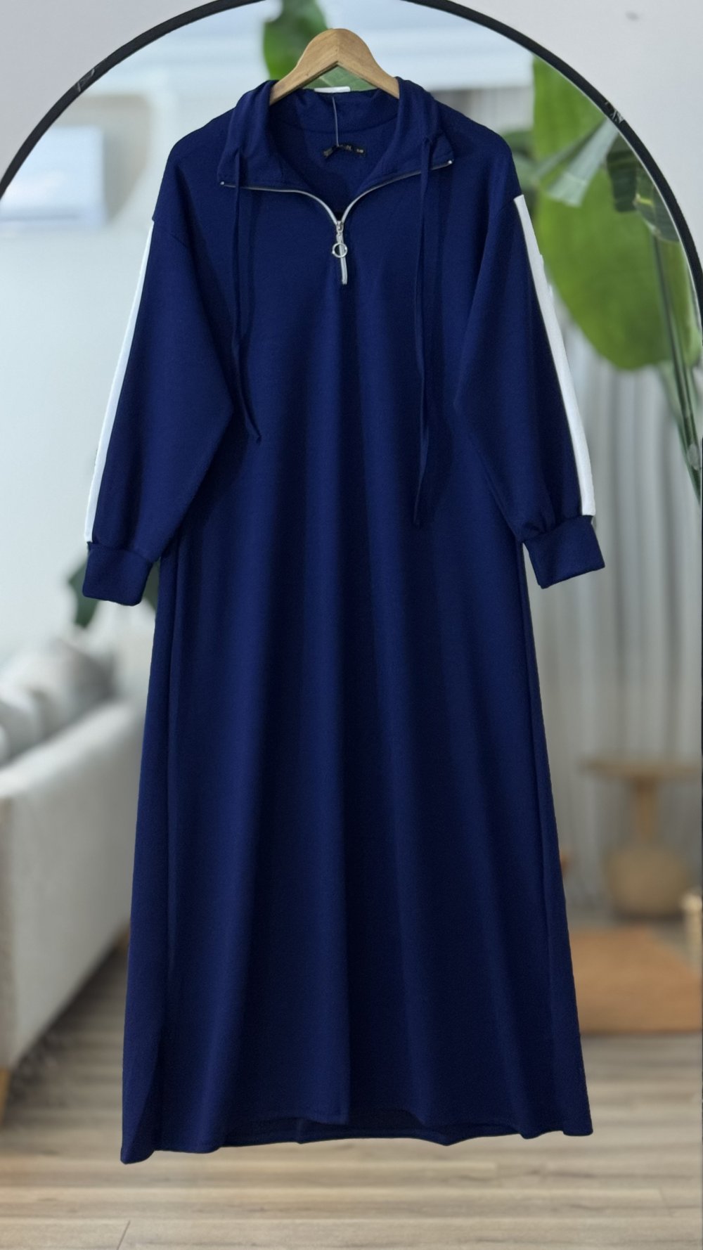Yaka fermuarlı kol beyaz şeritli Elbise Lacivert UMS40126