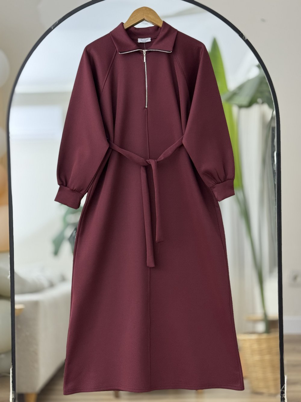 Yaka fermuarlı kuşaklı Elbise Bordo BK9520
