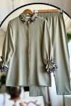 Taş işlemeli yaprak desen keten takım camel UMS5039