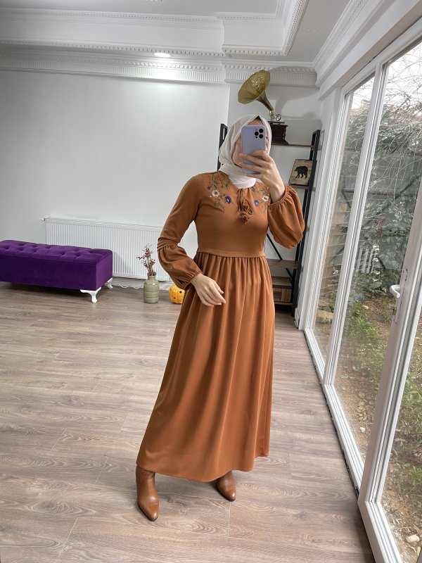 Yaka nakışlı örme krep elbise
