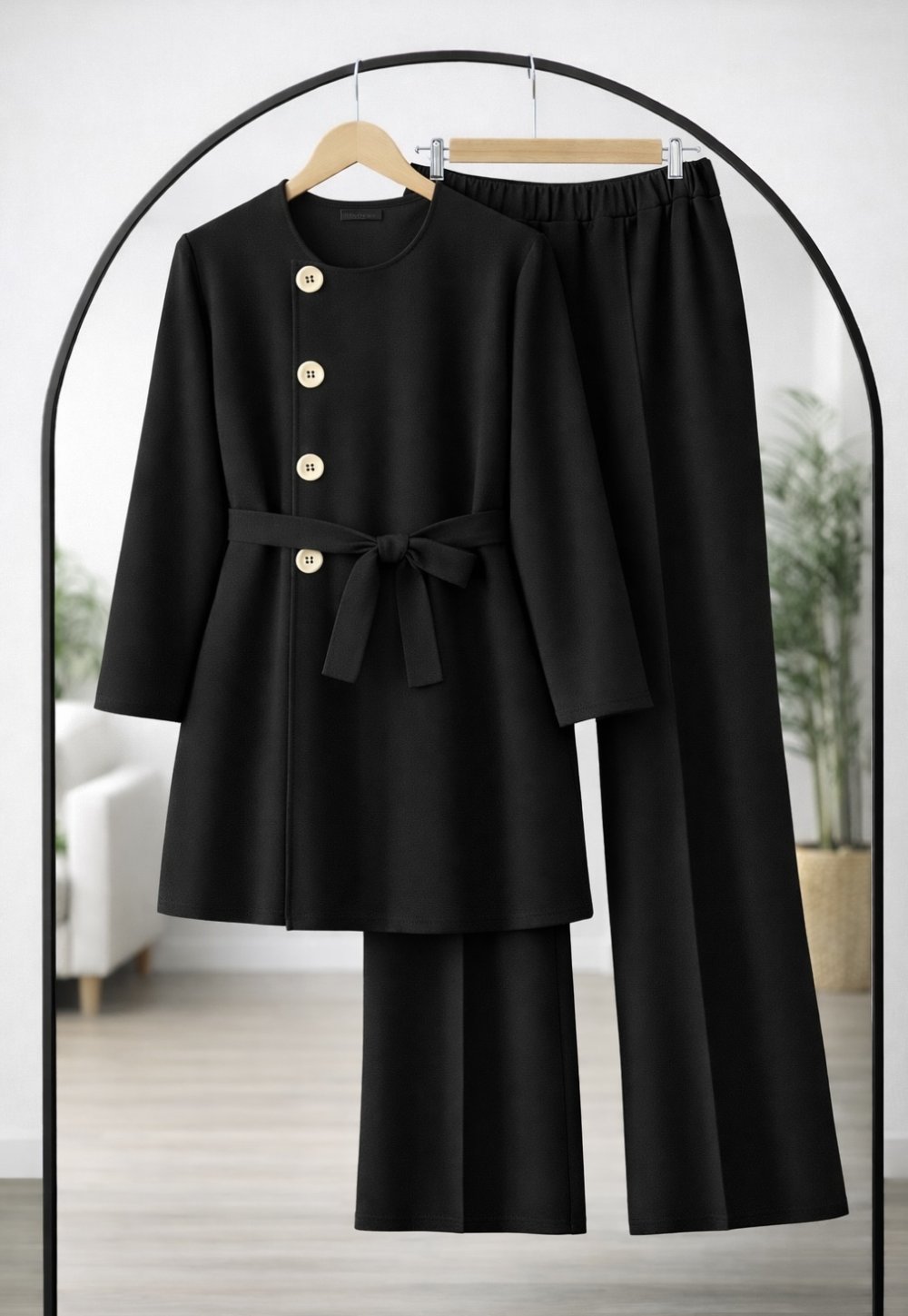 Yan Düğmeli Kuşaklı Takım Siyah TCN40151
