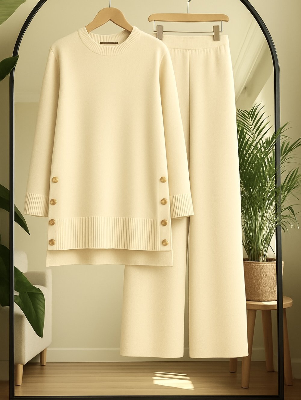 Yanlardan Düğmeli Triko Takım Ekru TCN 40147
