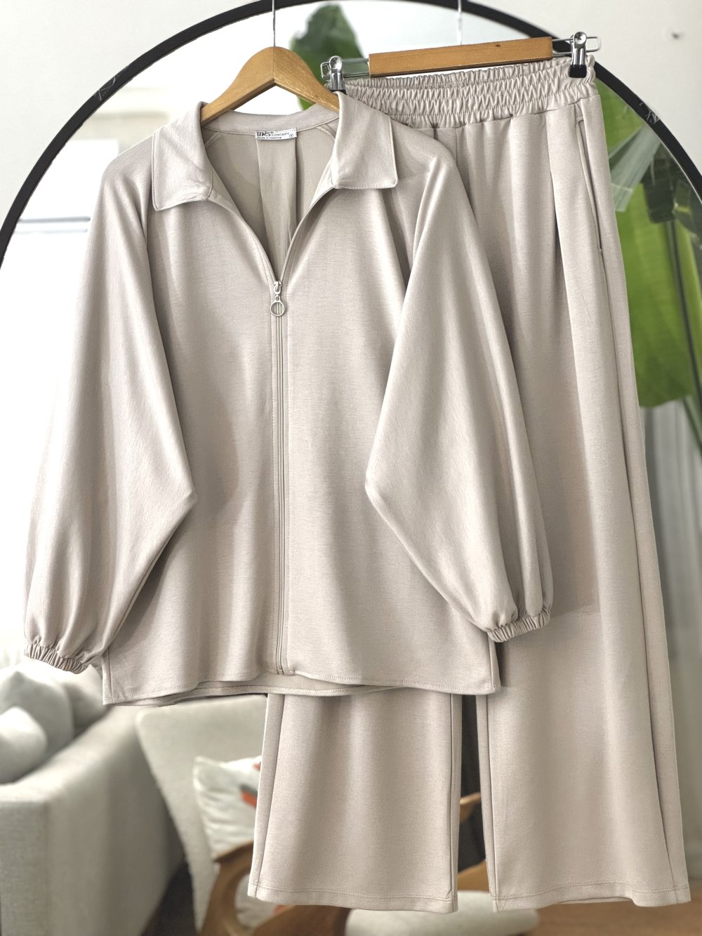 Yarasa kol fermuarlı ikili Takım Bej UMS50326