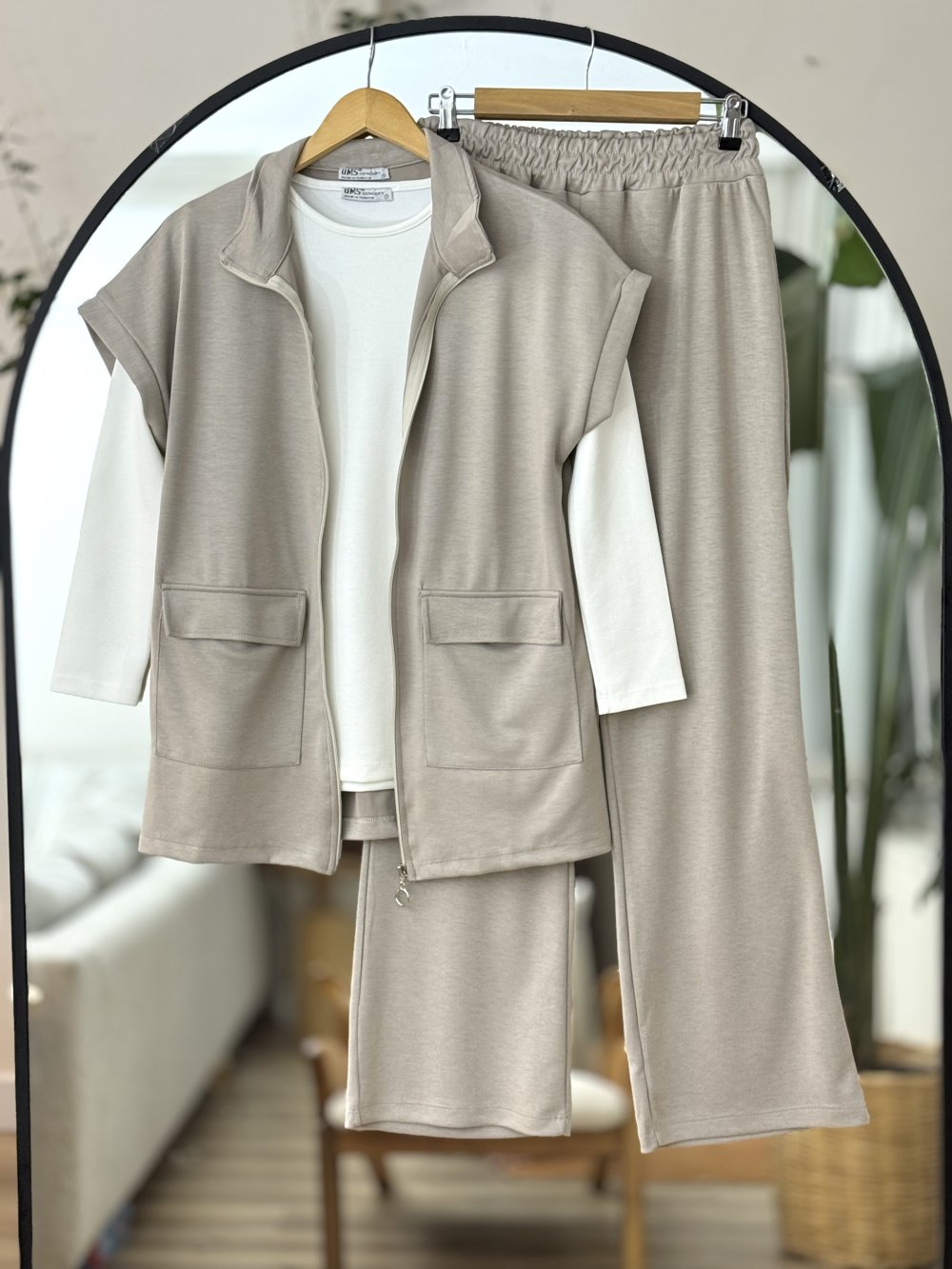 Yelekli fermuarlı üçlü Takım Bej UMS50312